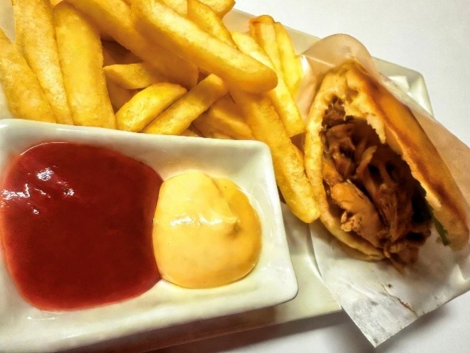 Roujiamo au poulet mariné avec des frites ou du riz 鸡肉肉夹馍套餐配薯条或米饭 8.9€