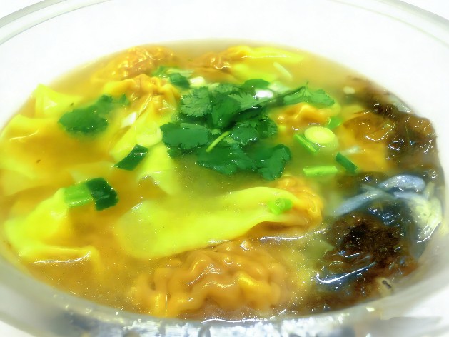 Soupe de Wontons au poulet et aux crevettes, servie dans un bouillon de poulet ( 12 pièces) 鸡肉虾云吞配鸡肉高汤 13.9€
